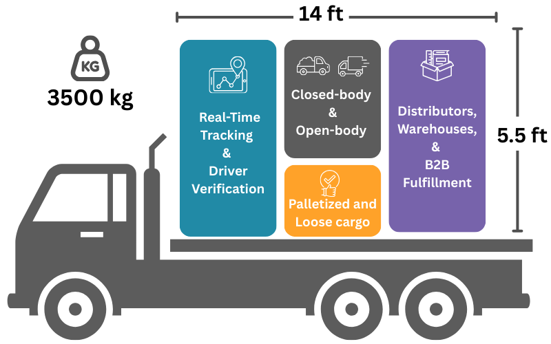 Our 14FT truck can handle up to 3.5 tons of commercial cargo like raw materials, large cartons, chemicals, and bulky inventory.